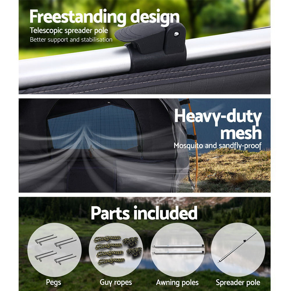 A 14oz 400gsm water-repellent Rip stop canvas cover, 500gsm PVC flooring and an extra 10cm high edge all round. Swagspeak for the ultimate tear-resistant waterproofing. Fully enclosed for privacy with zipped openings for fresh air anytime. Mesh panels to keep insects out. A 70mm high density foam mattress for better sleep on any surface. Thick aluminium support poles to hold up the entire set up.