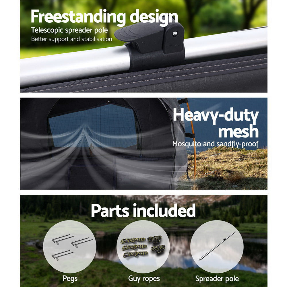 A 14oz 400gsm water-repellent Ripstop canvas cover, 500gsm PVC flooring and 10cm high edges all round. Swagspeak for the ultimate tear-resistant waterproofing. Fully enclosed for privacy with zipped openings for fresh air anytime. Mesh panels to keep insects out. A 70mm high-density foam mattress for better sleep on any surface. Thick aluminium spreader poles to hold the entire set up.